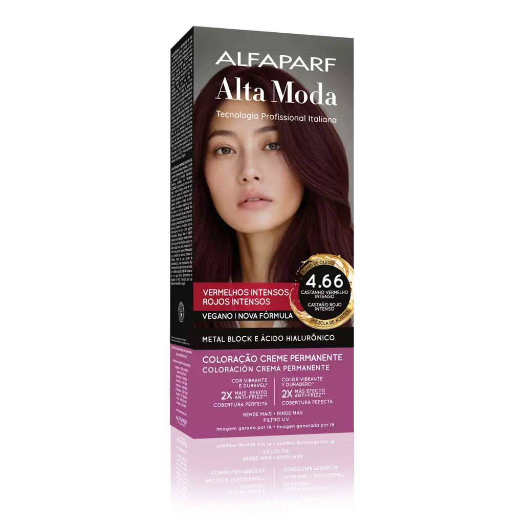 COMPOSIÇÃO / COMPOSICIÓN: Coloração Creme Permanente / Coloración Crema Permanente Alfaparf Alta Moda - Proc. ANVISA n˚.: 25351.451050/2024-88 - AQUA (WATER), CETEARYL ALCOHOL, PROPYLENE GLYCOL, CETEARETH-50, PEG-40 HYDROGENATED CASTOR OIL, 1 HYDROXYETHYL 4,5-DIAMINO PYRAZOLE, SULFATE, AMMONIA, LAURYL ALCOHOL, ETHANOLAMINE, M-AMINOPHENOL, 2,4-DIAMINOPHENOXYETHANOL HCL, MYRISTYL ALCOHOL, COCAMIDOPROPYL BETAINE, SODIUM SULFITE, PARFUM (FRAGRANCE), P-AMINOPHENOL, ERYTHORBIC ACID, POLYQUATERNIUM-22, EDTA, BISABOLOL, 1-NAPHTHOL, AMYL SALICYLATE, ETHYLHEXYL METHOXYCINNAMATE, HELIANTHUS ANNUUS (SUNFLOWER) SEED OIL, GLYCERIN, COCOS NUCIFERA (COCONUT) OIL, LINUM USITATISSIMUM (LINSEED) SEED OIL, SODIUM PCA, SODIUM LACTATE, SOY AMINO ACIDS, ARGININE, WHEAT AMINO ACIDS, ASPARTIC ACID, PCA, SERINE, THREONINE, ARGANIA SPINOSA KERNEL OIL, MACADAMIA TERNIFOLIA SEED OIL, OLEA EUROPAEA (OLIVE) FRUIT OIL, PERSEA GRATISSIMA (AVOCADO) OIL, ARGININE HCL, PENTYLENE GLYCOL, SODIUM HYALURONATE CROSSPOLYMER, HYDROLYZED RICE PROTEIN, PHYTIC ACID, ORYZA SATIVA (RICE) EXTRACT, GLYCINE, ALANINE, VALINE, SODIUM BENZOATE, ISOLEUCINE, PROLINE, TOCOPHEROL, HISTIDINE, PHENYLALANINE, POTASSIUM SORBATE. Para a lista completa e atualizada de ingredientes, consulte a embalagem do produto