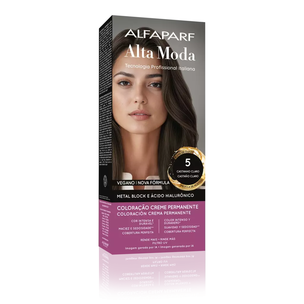 COMPOSIÇÃO / COMPOSICIÓN: Coloração Creme Permanente / Coloración Crema Permanente Alfaparf Alta Moda - Proc. ANVISA n˚.: 25351.451050/2024-88 - AQUA (WATER), CETEARYL ALCOHOL, PROPYLENE GLYCOL, CETEARETH-50, PEG-40 HYDROGENATED CASTOR OIL, AMMONIA, LAURYL ALCOHOL, TOLUENE-2,5-DIAMINE SULFATE, MYRISTYLALCOHOL, COCAMIDOPROPYLBETAINE, SODIUM SULFITE, RESORCINOL, PARFUM (FRAGRANCE), ERYTHORBIC ACID, POLYQUATERNIUM-22, ETHANOLAMINE, EDTA, BISABOLOL, M-AMINOPHENOL, AMYL SALICYLATE, 2,4-DIAMINOPHENOXYETHANOL HCL, ETHYLHEXYL METHOXYCINNAMATE, HELIANTHUS ANNUUS (SUNFLOWER) SEED OIL, GLYCERIN, COCOS NUCIFERA (COCONUT) OIL, LINUM USITATISSIMUM (LINSEED) SEED OIL, SODIUM PCA, SODIUM LACTATE, SOY AMINO ACIDS, ARGININE, WHEAT AMINO ACIDS, ASPARTIC ACID, PCA, SERINE, THREONINE, ARGANIA SPINOSA KERNEL OIL, MACADAMIA TERNIFOLIA SEED OIL, OLEA EUROPAEA (OLIVE) FRUIT OIL, PERSEA GRATISSIMA (AVOCADO) OIL, ARGININE HCL, PENTYLENE GLYCOL, SODIUM HYALURONATE CROSSPOLYMER, HYDROLYZED RICE PROTEIN, PHYTIC ACID, ORYZA SATIVA (RICE) EXTRACT, GLYCINE, ALANINE, VALINE, SODIUM BENZOATE, ISOLEUCINE, PROLINE, TOCOPHEROL, HISTIDINE, PHENYLALANINE, POTASSIUM SORBATE. Para a lista completa e atualizada de ingredientes, consulte a embalagem do produto.