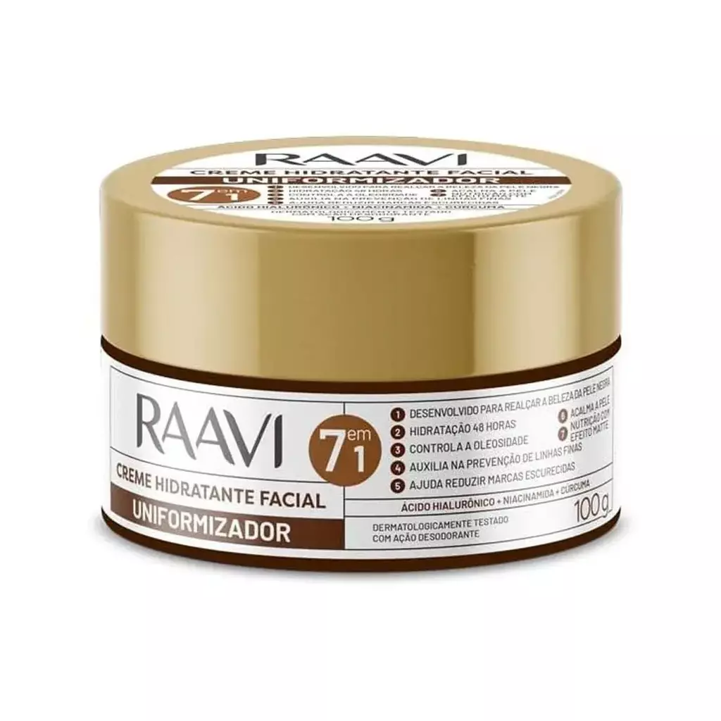 Creme 7 em 1 hidratante facial RAAVI foi desenvolvido também para realçar a beleza da pele negra. Fórmula avançada, auxiliando na uniformização do tom da pele e suaviza a aparência de marcas escurecidas. Nutrição com efeito Matte. Ativos: Ácido hialurônico, niacinamida, extrato cúrcuma, d-pantenol e manteiga de karité.